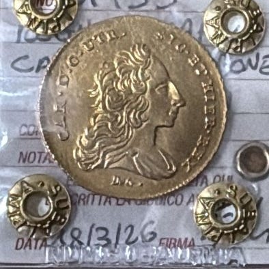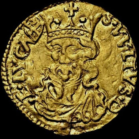 Kvart zecchino i guld, vægt cirka 0,8 g, doge Ludovico Manin 1789–1797, Venetiens sidste doge, mønt