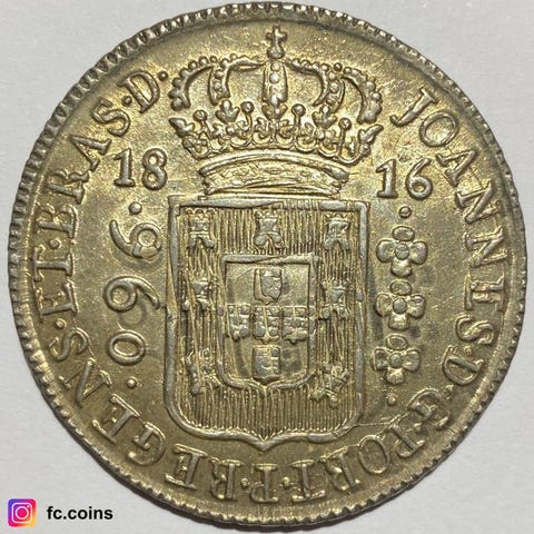 Den 1816 12 Vinténs er en mønt med enorm historisk vægt, der markerer sidste år af regencyen for D. João (den fremtidige konge João VI) før han tiltrådte tronen efter sin mor, dronning Maria I’s død. Rettet i 0.917 ren sølv, blev denne ”240 Reis”-del præget i overgangsperioden, hvor den portugisiske kongelige domstol stadig var etableret i Brasilien efter deres flugt fra Napoleons tropper. Som følge heraf er mønter fra denne specifikke æra ikke blot valuta, de er artefakter af et ”Transatlantisk Monarki”, der byggede bro mellem den gamle og den nye verden.
