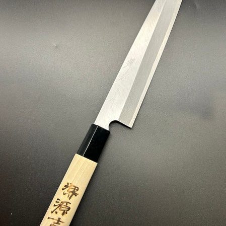 Håndtagslabel: “切味抜群 最高級御料理包丁” (Udmerket skarphed, højeste kvalitet