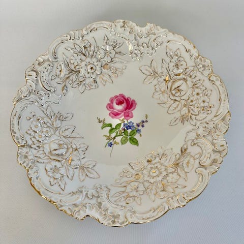Velkommen! Vi præsenterer en udsøgt rund suppeskål med låg i blomstermotiv patineret, gyldne finish og tænderkant, sidehåndtag i acantusbladform.