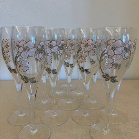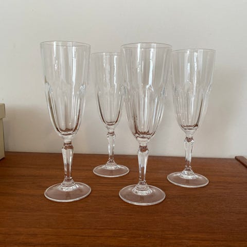 Smukt sæt på 6 antikke krystal Val Saint Lambert champagnefløjter. Model 'Lalaign', Belgien, begyndelsen af det 20. århundrede.