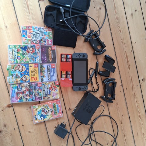 Jeg sælger et komplet Nintendo Switch-sæt bestående af en Switch-konsol (V1-version) sammen med mange spil og tilbehør.