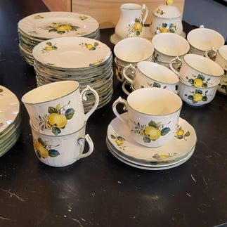 En kollektion, der udmærker sig ved et stilfuldt og rustikt design med blødt buede riller. Dekoren viser gule frugter, blomster og en gulspurv i friske gule og grønne nuancer.