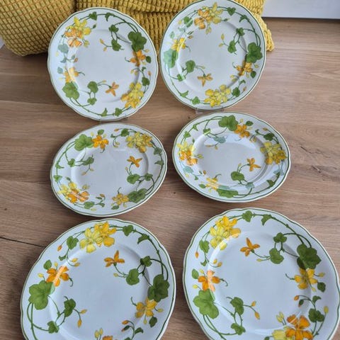 Frühstücks-, Kuchen-, Desserttallerkener fra serien "Jamaica", fremstillet i porcelænsfabrikken Villeroy & Boch, i Luxembourg.
