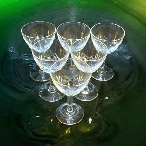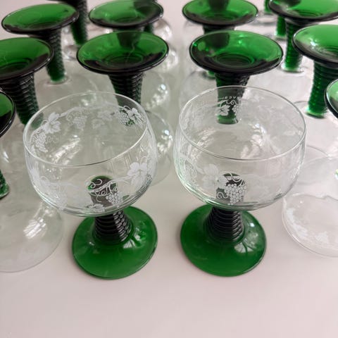 Val Saint Lambert 'Riquewihr' romere er klassiske, slebne krystalvintglas, kendt for deres slebne "cut-to-clear"-teknik. Dette specifikke mønster blev produceret i midten af det 20. århundrede, med en top i popularitet i årene 1950-1970, inden for det velkendte bordkristaludvalg fra Val Saint Lambert.