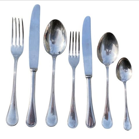 Elegant bestikssæt signeret Abert, ikonisk mærke inden for italiensk bestik, kendt for kvaliteten af rustfrit stål og for et sobert, funktionelt og tidløst design, som fuldt ud repræsenterer den italienske produktion i 80’erne og 90’erne.
