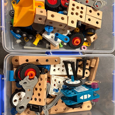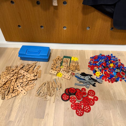 byggesæt konstruktionslegetøj med forskellige byggeelementer i træ og plast. Sættet indeholder blandt andet træstænger med huller, skruer, møtrikker, skiver og klodser i flere farver. Delene kan samles til forskellige figurer og modeller ved hjælp af de medfølgende værktøjsdele. Egnet som kreativt konstruktionslegetøj til børn, hvor der kan bygges og samles efter egen fantasi eller efter vejledningen på æsken.