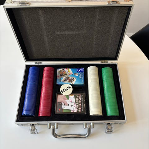 Poker sæt med jetoner og kort i kuffert. Sættet indeholder pokerchips i flere farver, to kortspil, terninger samt dealer- og blind-knapper. Alt er samlet i en hård metalkuffert med håndtag og låse, som beskytter indholdet under opbevaring og transport. Velegnet til hjemmebrug og pokeraftener med flere spillere.
