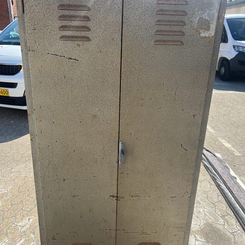 Vintage metalskab med 2 rum. Kan bruges til omklædning, opbevaring mv. Skabet er hvidt og velholdt.