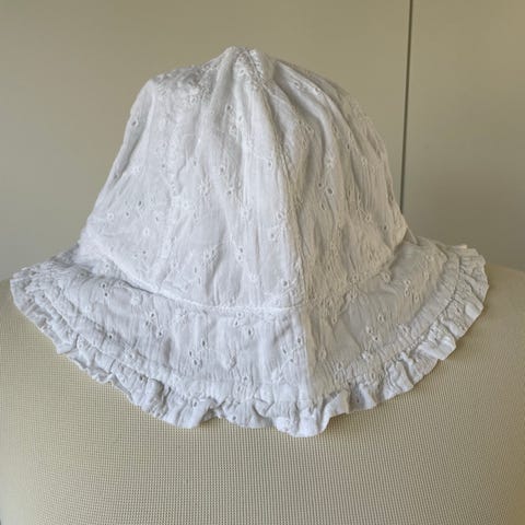 babyhat i str. 50 til unisex. Hatten er hvid og fremstillet i bomuld med broderie anglaise-lignende mønster og skygge hele vejen rundt. Den har bindebånd under hagen og elastik bagpå for bedre pasform. Egnet til spædbørn omkring str. 50 og kan bruges som solhat eller let overgangshat.