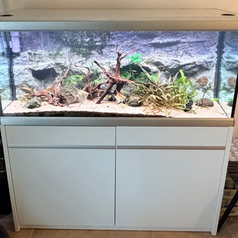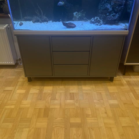 Akvariet er tømt og står klar til afhentning i stueplan. Prisen er fast og akvariet sendes ikke. Samlet vægt er lidt over 65kg og kan uden problemer bæres af to personer.