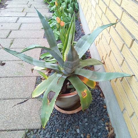 Grøn stueplante i rund lerkrukke. Diameter 30 cm, højde 25 cm.