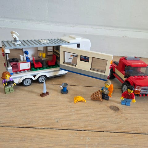 LEGO City 60182. Der medfølger flere minifigurer samt små dele som fisk, krabbe og udstyr til udendørsaktiviteter enkelte af disse dele mangler.