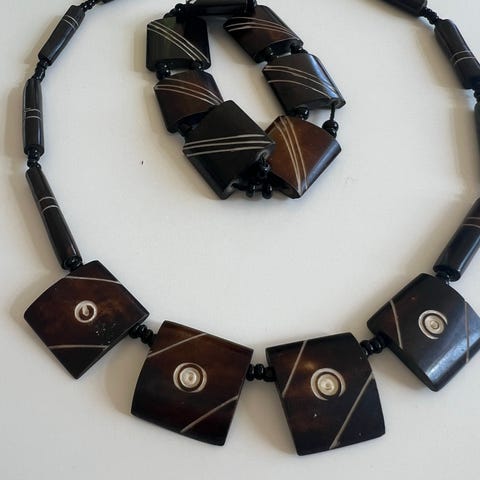 & Other Stories smykkesæt bestående af halskæde og armbånd til kvinde. Sættet har mørk snor med cylindriske blå perler kombineret med metalfarvede detaljer. Halskæden lukkes med karabinlås, og armbåndet har tilsvarende lukning og design, så delene kan bruges sammen eller hver for sig.