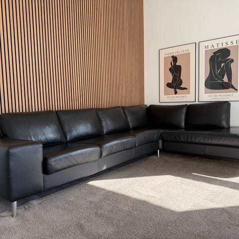 Lækker hjørnesofa med puf, der passer til sofaens form så den ene side bliver en chaiselong. Puderne er bløde og læderet er blødt – så blødt at det føles næsten sart. Ben og underkant i tidsløst stål. Læderbeklædt på bagsiderne så den kan stå frit i lokalet og stadig se flot ud. Nypris ca. 36.000 så det er virkelig kvalitet.