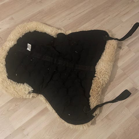 Rideudstyr pad med blød lammeskindslignende underside i naturfarve og mørkeblå overside. Formen er ergonomisk udskåret, og padden har stropper til fastgørelse på sadlen. Egnet som underlag mellem hest og sadel for ekstra komfort og trykfordeling.