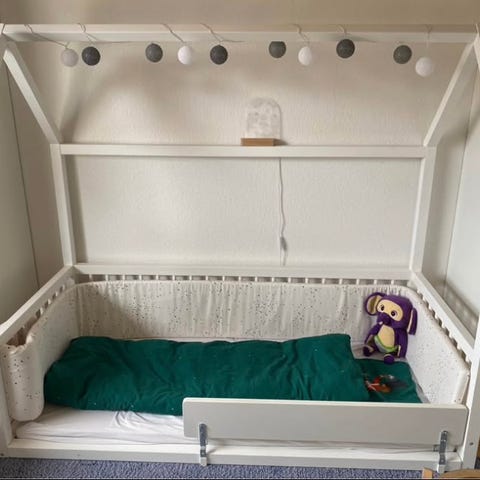 Juniorseng i hvidt design med husseng-ramme. Sengen har tremmer på siderne og en lav indstigning, tremmerne kan rykkes alt efter behov. Konstruktionen er i træ og er udformet som et hus, hvilket giver mulighed for at tilføje sengehimmel eller anden dekoration efter behov. Sengen er velegnet til brug på børneværelset som overgangsseng i juniorstørrelse. Madrassen medføre og er som ny, plastikken er aldrig blevet taget af. Plads til bedroller under sengen.