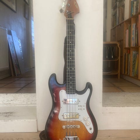 Teisco el-bas med 4 strenge i sunburst-finish. Bassen har to singlecoil-pickupper, tre kontrolknapper og en switch til pickup-valg.