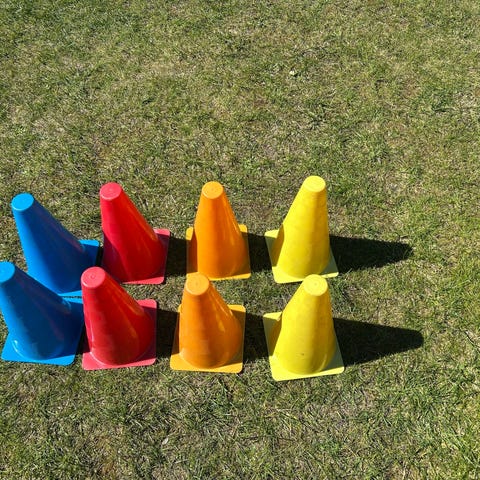 Tennisbolde i flere farver, herunder blå, orange og gul. Boldene er standardstørrelse.