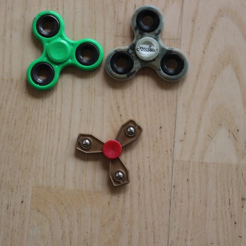 Sæt med 4 fidget spinnere i farverne gul, sort, grøn og gul med rød knap. Fremstillet i plastik med kuglelejer. Egnet til håndbrug for stressaflastning og finmotorisk træning.