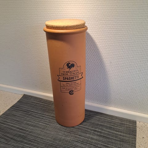 Pastabeholder i klassisk toskansk terrakotta med korklåg. Indersiden er glaseret, på ydersiden tryk. Mindre brugsspor. Højde 22 cm, dia. 14 cm.