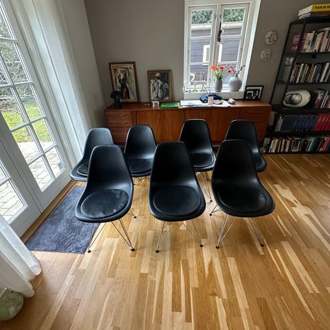 Sælger 4 originale sorte Eames-stole med Eiffel-stel fra Vitra. Stolene er fra 2011/2012 og står med de originale mærkater under bunden.