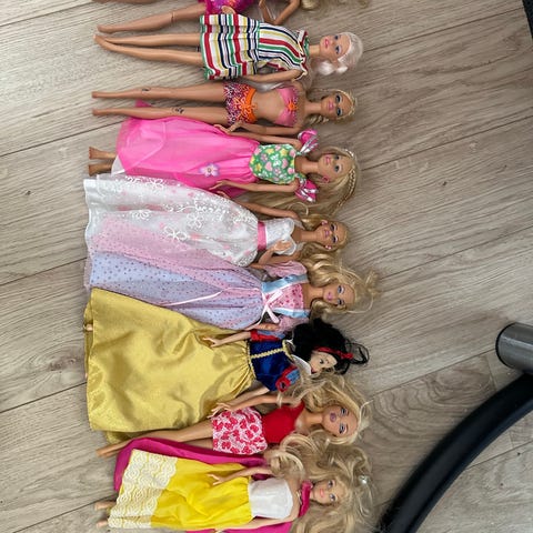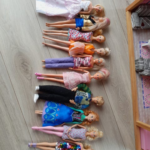 Barbie og Bratz dukker og tilbehør sæt. Samling af flere dukker, både kvindelige og mandlige figurer, i forskellige outfits. Medfølger kasser med ekstra tøj, sko og små accessories til leg og udklædning.