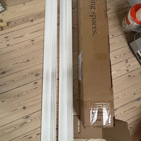 Loftstuk lister i hvid med ornamenteret bladmotiv. Velegnet som dekorativ afslutning mellem væg og loft i indendørs rum. Den ene har enkelte steder med afskalninger i overfladen som kan males efter montering.