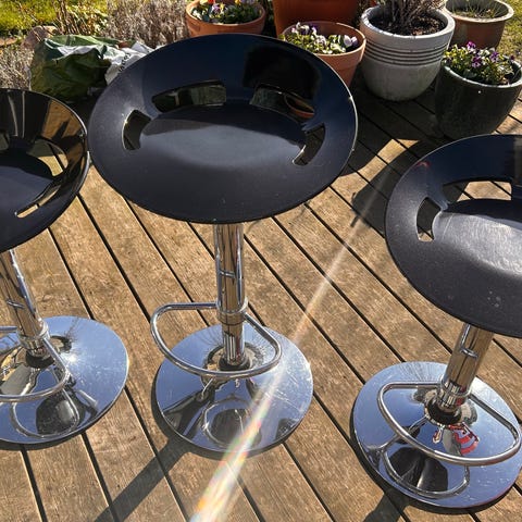 Designerbarstole med hæve/sænkfunktion. Er brugte men i god stand. Almindelige brugsspor. Lidt overfladisk rusk på metallet