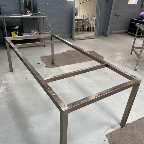 Solidt og stabilt stel i pæn stand. Har båret en stor og tung bordplade uden problemer.