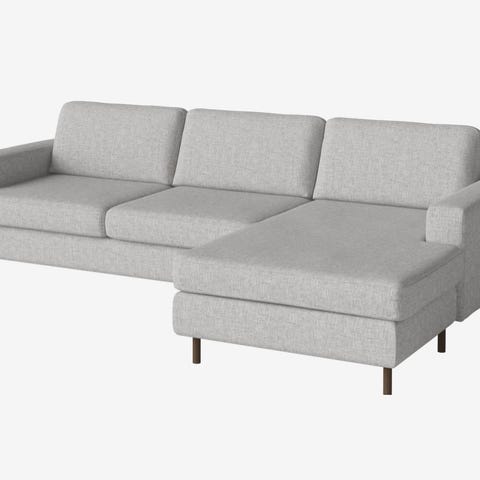 3 1/2 personers chaiselong-sofa i gråt stof med fyld af koldskum.