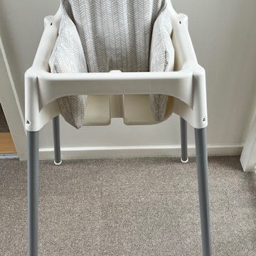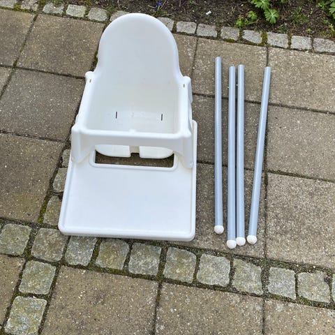 IKEA højstol i hvid plastik med grå metalben. Højstolen har formstøbt sæde med ryglæn og benudskæring, som giver støtte til barnet ved måltider. Benene er aftagelige, hvilket gør stolen nem at opbevare og transportere. Velegnet som spisebordsstol til små børn, der skal sidde stabilt ved bordet.