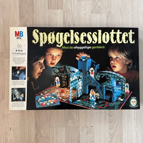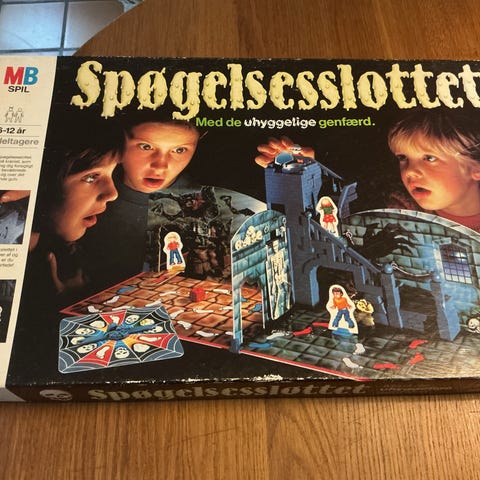 MB Spøgelsesslottet brætspil. Spillet består af en tredimensionel spilleplade med slots- og spøgelsestema, plastdele til opbygning af slottet, spillebrikker med figurer, terning og små tilbehørsdele. Egnet som familiespil og til børn, hvor spillerne bevæger sig rundt i slottet og undgår forskellige fælder og spøgelser. Antal dele og eventuelle mangler bør kontrolleres i forhold til den originale indholdsoversigt.