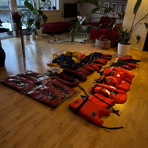 4 stk redningsveste, 150N plus 90kg. Tror aldrig at de er blevet brugt, det var reserveveste i båden for en sikkerhedsskyld, hvis vi fik gæster ombord. så skal de være der.