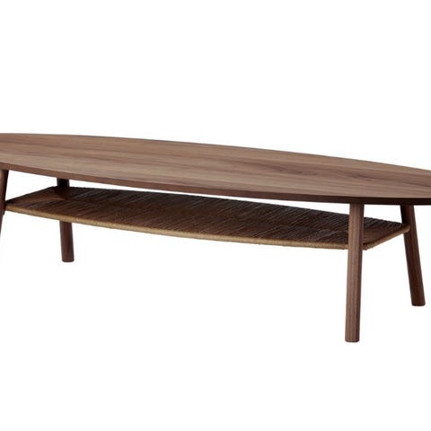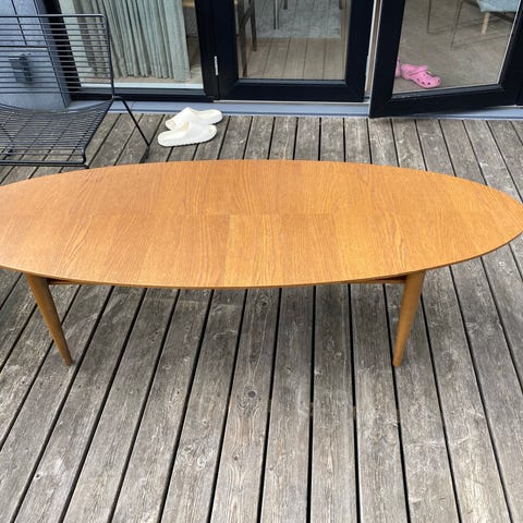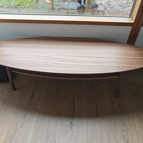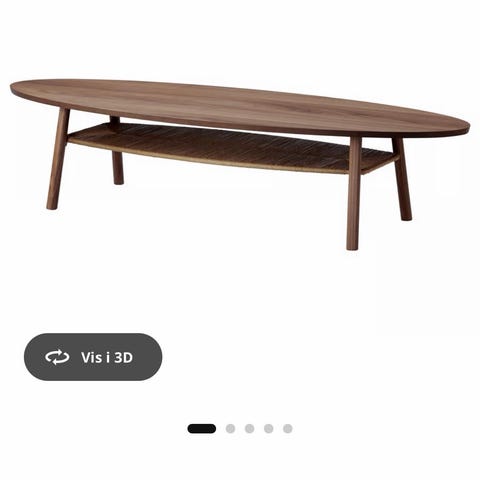 IKEA sofabord i ovalt design. Bordet er udført i træ med brun træfinér og har slanke, runde ben. Under bordpladen er der en åben hylde til opbevaring af f.eks. fjernbetjeninger, bøger eller magasiner. Bordpladen har synlige træårer og enkelte overfladeridser (se billeder). Velegnet som sofabord i stue eller opholdsrum.