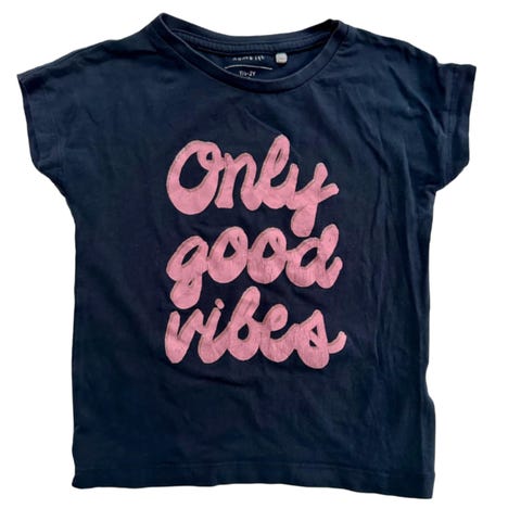 Kortærmet marineblå t-shirt med blomster motiv og guld glimmer skrift. Printet er intakt.