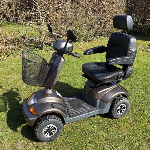 Shoprider City el-scooter med 4 hjul i sort. Modellen har justerbart sæde med armlæn og nakkestøtte samt fodplade med skridsikkert underlag. Scooteren er udstyret med kurv foran, spejle, lys for og bag samt betjeningspanel på styret. Egnet til persontransport på korte og mellemlange ture på fortov og jævne underlag.