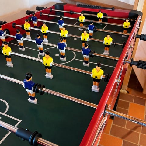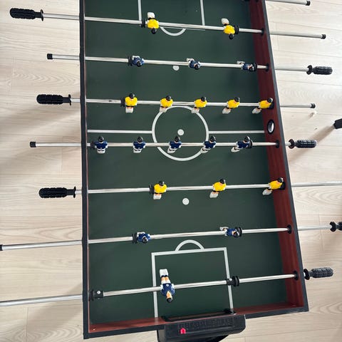 Bordfodboldbord med grøn spilleflade og figurer monteret på metalstænger med sorte plastikhåndtag. Bordet har manuel måltæller i hver ende. Bordet har også pool og keglebillard. Der medfølger vendbare spilleplader med felter til blandt andet skak/dam, backgammon og et pointspil, så bordet kan bruges til flere forskellige spil. Velegnet som indendørs spillebord til hjemmet eller fællesrum.