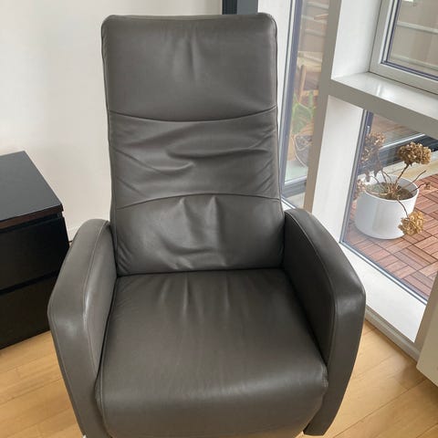 Lænestol i sort PU sælges, virker superfint i udtrækket men er slidt på nakkestøtten se billede
