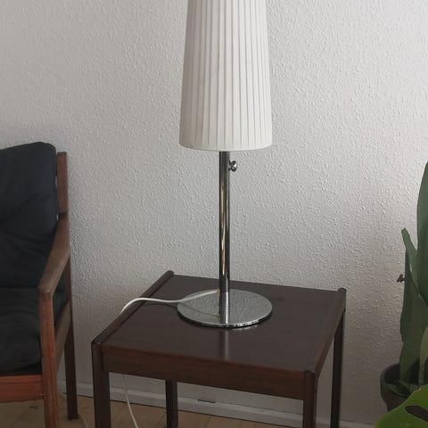 IKEA gulvlampe med opadrettet lys. Lampen har sort stel og rund fod samt en hvid halvkugleformet skærm i plast øverst. Trækafbryder sidder på ledningen et stykke oppe ad stangen. Egnet som grundbelysning i stue, soveværelse eller andre opholdsrum. Pære medfølger normalt ikke og kan udskiftes efter behov afhængigt af ønsket lysstyrke og lysfarve.