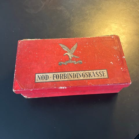 Falcks Redningskorps lille forbindingskasse i træ. Kassen er udformet som en rektangulær trææske med hængslet låg og trykt indholdsfortegnelse på indersiden af låget. Udvendigt har den Falcks Redningskorps mærke på låget og siden. Indvendigt indeholder den originale forbindingsmaterialer, herunder forbindinger, vandsugende vat og diverse pakker med medicinsk udstyr, som angivet på indholdslisten. Velegnet som samlerobjekt eller til dekorativ brug.