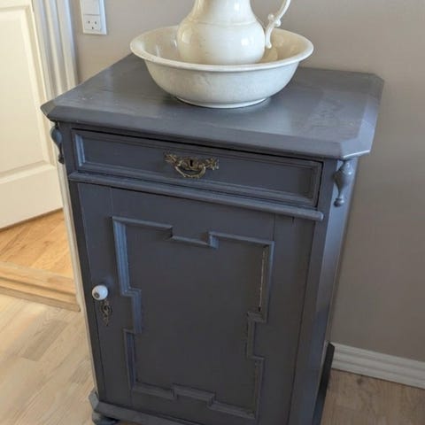 Fint lille skab med skuffe. ca. 75cm højt og 38x38 cm. Glas plade skal bare pudses, ellers er skabet intakt og rigtigt flot.