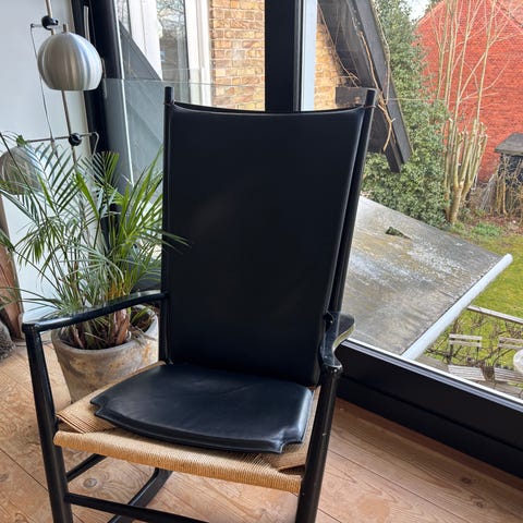Hans J. Wegner gyngestol i træ med høj ryg og armlæn. Stolen har sortlakeret stel og naturfarvet fletsæde i papirflet. Designet er egnet som loungestol eller læsestol i stue, soveværelse eller andre opholdsrum. Klassisk skandinavisk design med lodrette tremmer i ryggen og buede meder, der giver en rolig gyngende bevægelse.