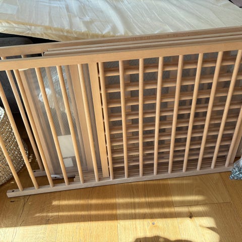 IKEA tremmeseng i træ. Klassisk tremmeseng med lamelbund og tremmer på tre sider. Fjerde side er åben, og der medfølger sengehest. Sengen er velegnet til små børn og kan bruges fx som ekstra juniorseng hos bedsteforældrene. Fungerer også fint som legesofa til børn. Skummadrass medfølger. Betrækket er lidt skjoldet, men fungerer fint med lagen på.