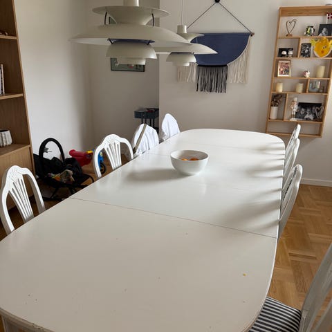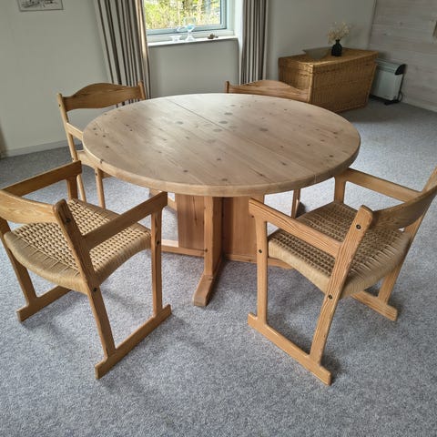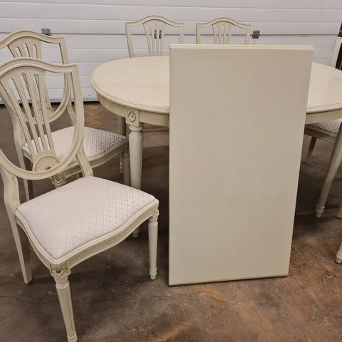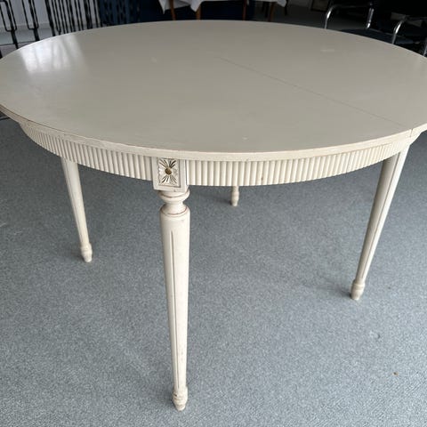 Gustaviansk stil. 135 cm i diameter og der kan lægges 4 plader i så det bliver 375 cm samlet. Hver plade er 60 cm. Der er to bukke til at holde bordet stabilt. Den ene sidder fast under bordet og den anden er løs.