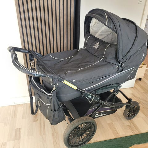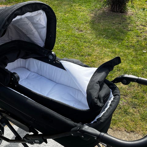 Inderforet i liggedelen er lyst, og der medfølger matchende overdel/forlæder til at lukke af omkring barnet. Madras og madraslagen medfølger. Ligesom der kan medfølge en barnevognssele (som også er brugt).
