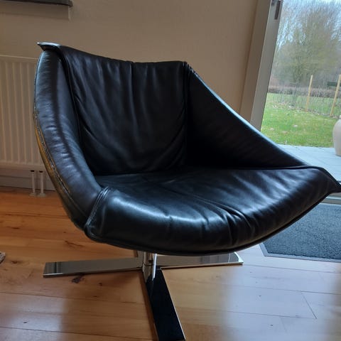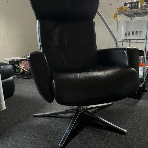 Velholdt sort lænestol I læder med vippe funktion og træfod,sælges pga pladsmangel