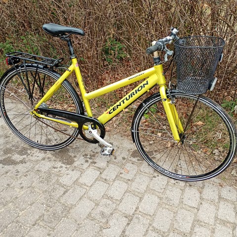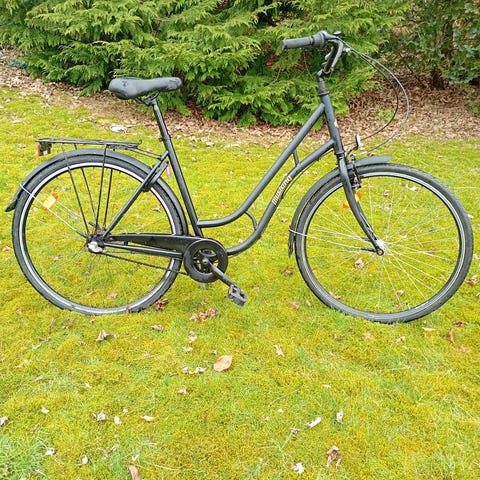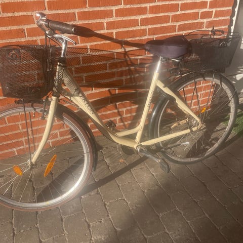 Godt brugt med få rustmærker rundt omkring og maling skallet af et enkelt sted. Gearet sidder fast i 2. gear, men kører ellers godt. Fungerer godt som sommerhuscykel.