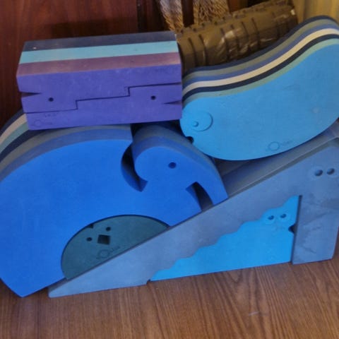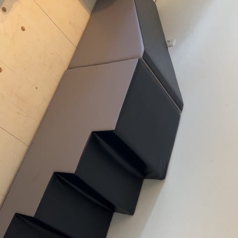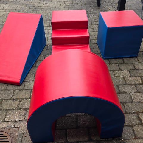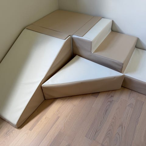 JLY legetrappe skummoduler i grå og hvid. Sættet består af flere skumdele, blandt andet rampe, trappetrin, firkantede og trekantede moduler, som kan sættes sammen på forskellige måder. Overfladen er i glat tekstil, der er velegnet til indendørs brug på gulv. Egnet til mindre børn til motoriktræning, leg og klatring under opsyn af en voksen.