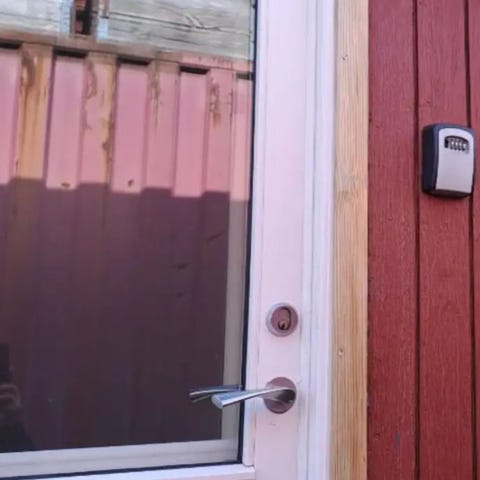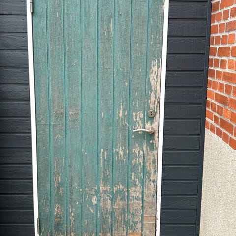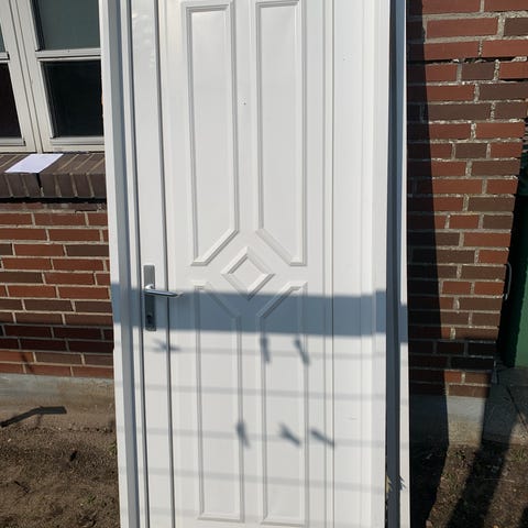 Hvid yderdør med fyldningsfelter. Døren har karm og er udstyret med greb og låsekasse. Velegnet som udskiftningsdør til fx skur, udhus eller sekundær indgang. Materiale fremstår som malet træ eller komposit med glat overflade og tætningslister i kanten.